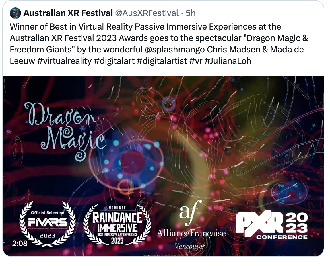 It's the end of the year and I'm so honored that our project has been chosen as Best in VR Passive Immersive Experiences at the AustXR Festival. (Includes 360 videos and any kind of projects where the integrity of the artwork/video does not change in response to stimuli. ex. bespoke story-based) In this post, I will be shining the light on my Australian team mate: Mada de Leeuw