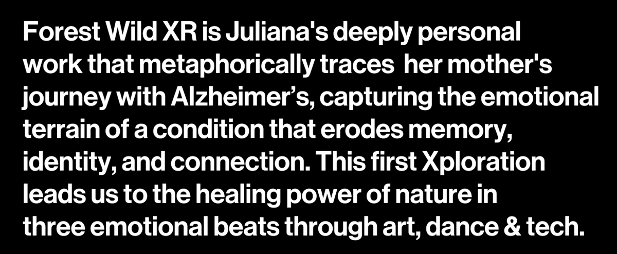 Living with Alzheimer’s isn’t fun. My mother has the disease, and while it’s been tough in so many ways, it’s also taught me a lot about what’s really important in life. In the Forest Wild XR project, I wanted to look at the themes of: