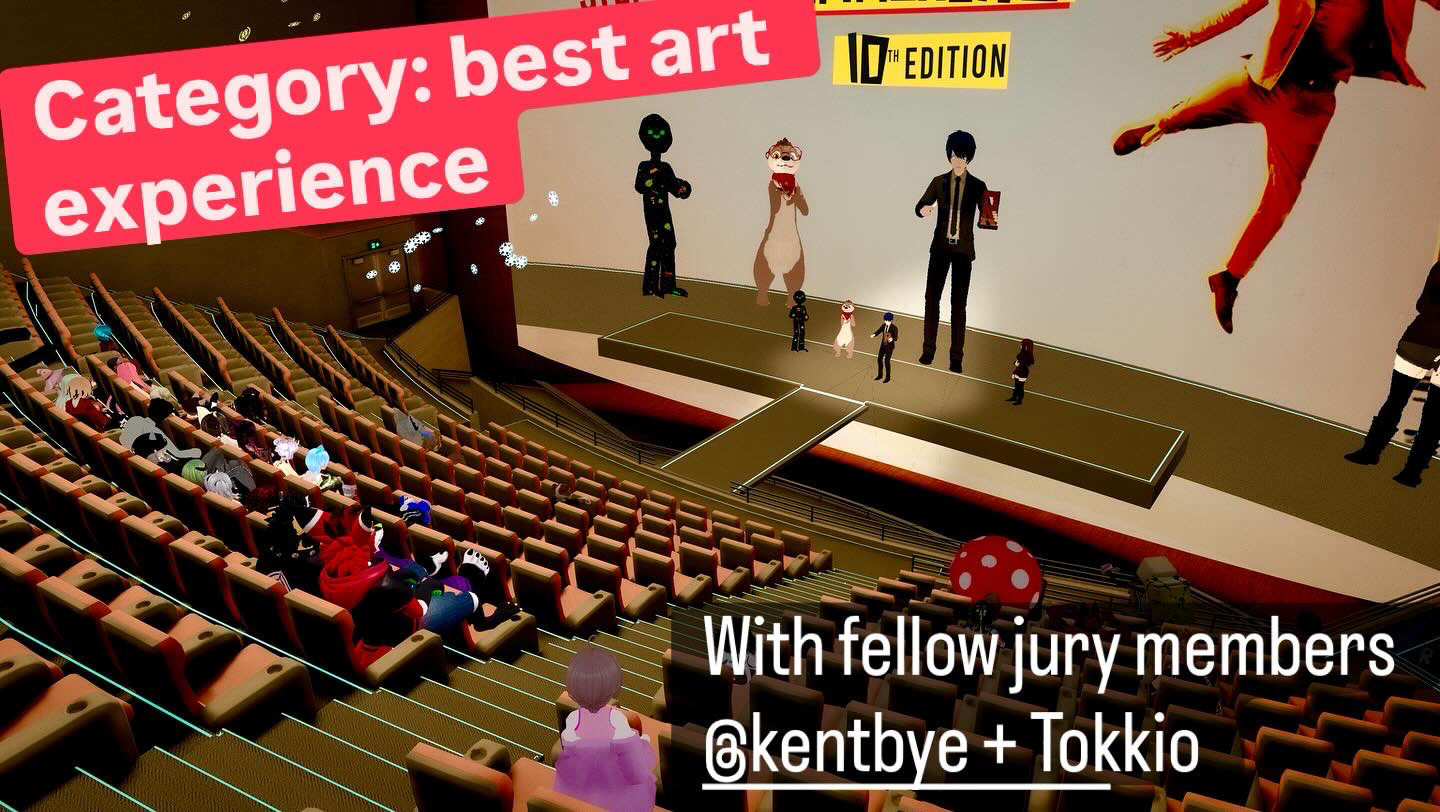 I've been an active member of this community since 2021. We were first invited by Maria to show our award-winning world 'Awaken the Giants' in Altspace. Unfortunately, our world disappeared before the actual convening of the show. Fast forward to 2023 and we were nominated again in the category of art experiences. This year, I am returning as a member of the esteemed jury, a privilege that makes me feel very special :) I get to hang out with my fellow jury members Kent Bye and Tokkio. We will be presiding over the Best Art Experience Category.