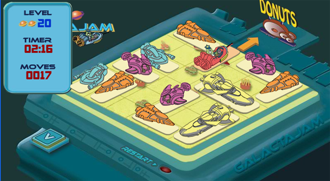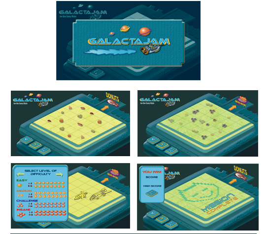 Galactajam is a 'traffic game' and was designed for the Sony Mylo first but could be hosted on other hand-held devices. I worked virtually with designers all over the US especially with my friend Jeremy who designed the levels.